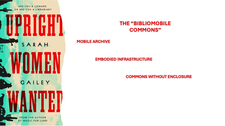 Good morning, and thank you for having me. I am interested today in how Sarah Gailey’s novella, Upright Women Wanted (2020), reveals what I call post-land Americanism. The novella rejects the frontier myth that made land, conquest, and masculine individualism the foundation of U.S. identity. Instead, it presents queer resistance and collective survival. So my claim today is simple. If the old frontier shaped Americans, then now, mobile archives, or what I will call “the bibliomobile commons,” shape post-land Americans.